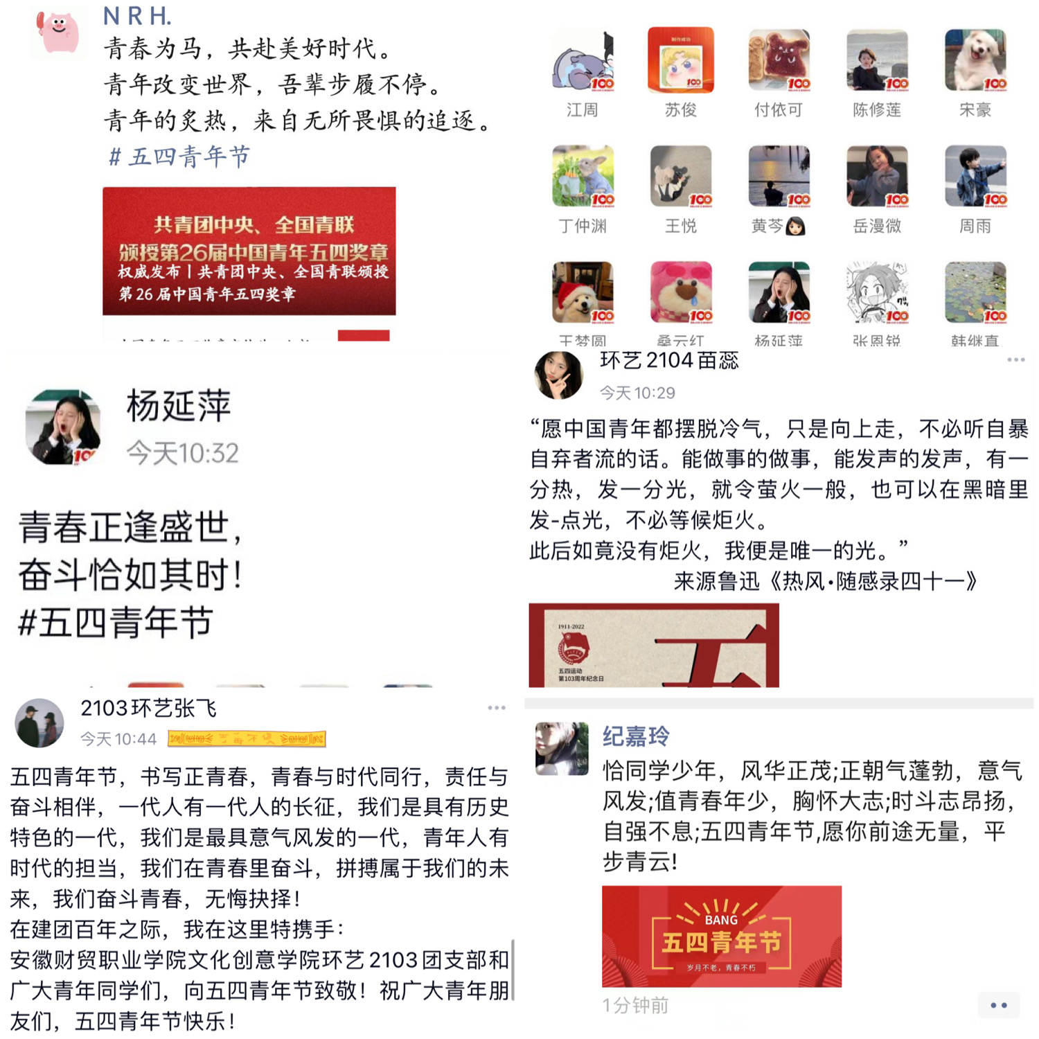 组织青年学生线上开展学习阅读《习近平与大学生朋友们》系列文章和观看“第26届中国青年五四奖章获奖颁奖”新闻视频,并组织开展青年团员共话成长交流研讨。通过QQ、微信、抖音等融媒体,引导青年学生发扬“五四”精神,传播积极向上的青春正能量。
