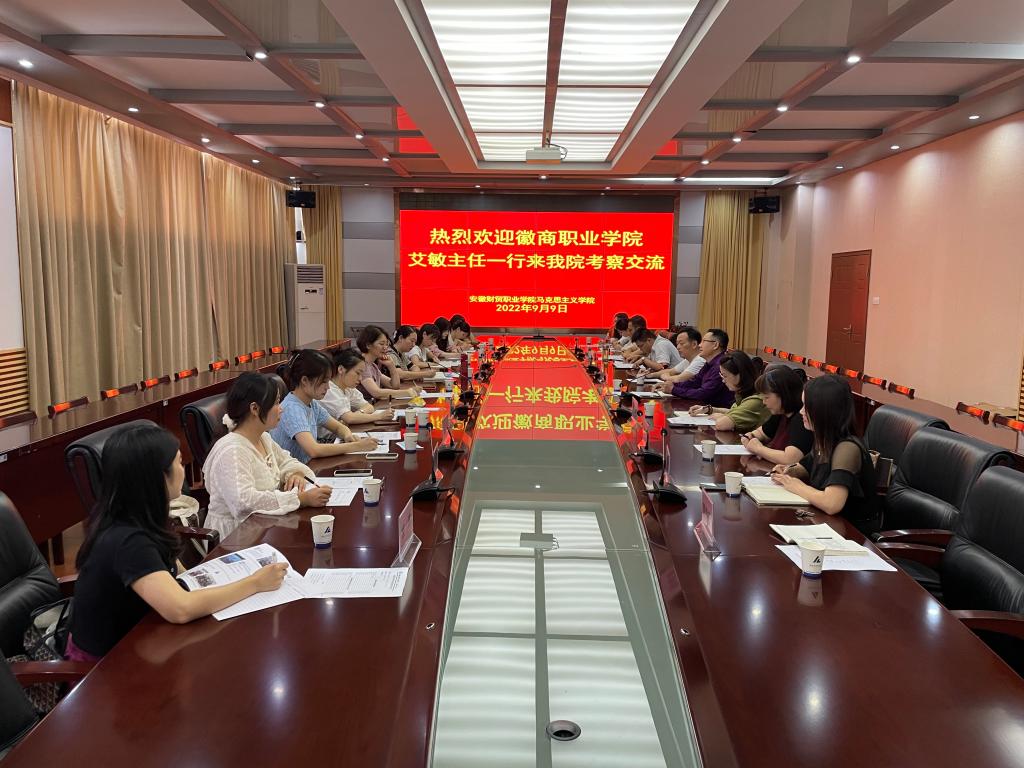 9月9日下午,徽商职业学院思政部主任艾敏一行到访马克思主义学院进行交流座谈会,马克思主义学院副院长张少兵、崔学明,办公室主任郭清及专任教师参加交流会。