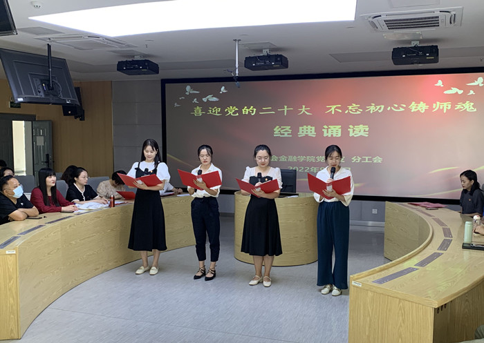 9月7日下午,财会金融学院党总支、分工会在A502实训室开展“喜迎党的二十大 不忘初心铸师魂”经典诵读活动,抒发爱党爱国情怀和对教育事业的无限热爱。