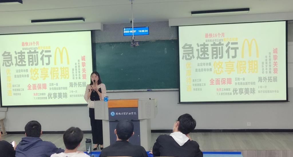 2022年5月27日下午,经济贸易学院开展首场招聘活动,安徽联升餐饮服务有限公司(麦当劳)、安徽黑土妈妈食品科技有限公司两家单位来校开展招聘宣讲会,经济贸易学院27个毕业班参加了双选会。