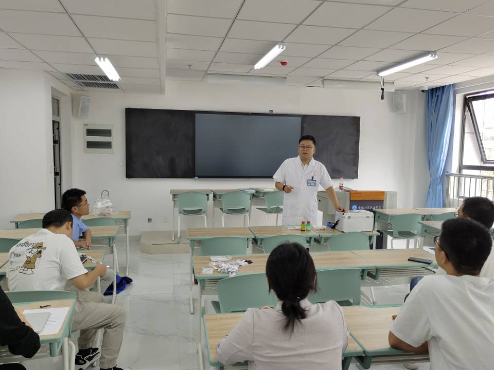 培训会上,魏立新从平时接诊中遇见到的在校大学生常见的校园意外伤害如常见的鼻出血、外伤伤口压迫、止血、消毒、包扎等急救技术及紧急情况下处置流程和方法。对伤口清创消毒步骤和处理过程中的注意事项,学生意外烫伤紧急处置“冲、脱、泡、盖、送”五步流程等进行详细的解说和演练。最后对院前急救的核心环节“心肺复苏”做重点讲解内容,对心跳骤停的判断、心肺复苏(CPR)的方法、步骤、操作注意事项以及复苏成功的临床指征等方面一一进行讲解演练。