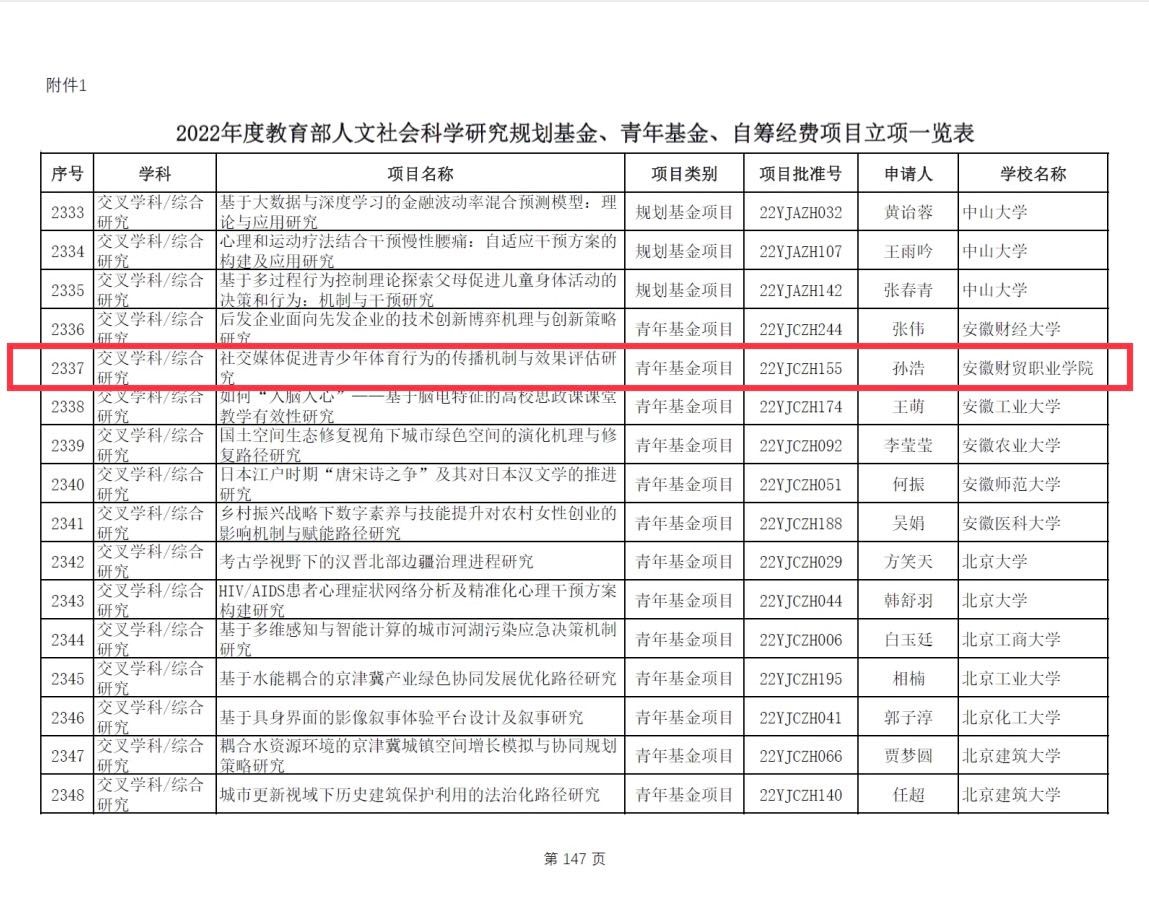 统计显示,2022年,全国共有672所高校的2801个项目入选,其中,54所高职院校有68个项目入选,安徽省高职院校仅有我校1个项目入选。教育部人文社科研究一般项目是教育部面向全国普通高等学校设立的人文社科研究项目,是人文社科领域仅次于国家社科基金的科研项目,该项目选题立意新,学术价值高,评审程序严格,项目权威性强,平均立项率低(2021年立项率为8%),是衡量高校人文社科科研水平的重要指标之一。