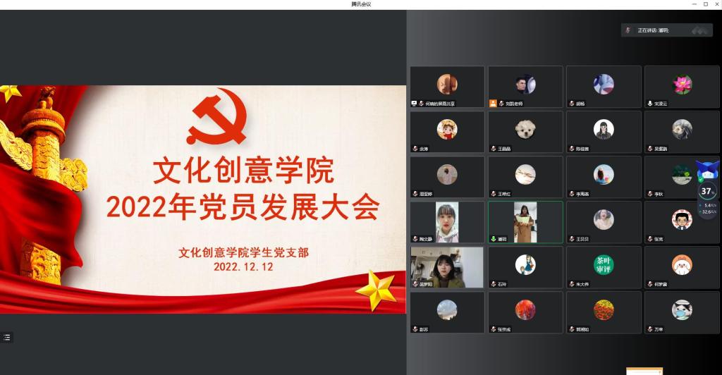 12月12日下午,文化创意学院学生党支部召开线上党员发展大会,大会讨论了关于是否吸收接纳党员发展对象陶文静等11位同志的问题。学生党支部书记宋凌云同志主持会议,支部全体党员及党员培养联系人参加会议。