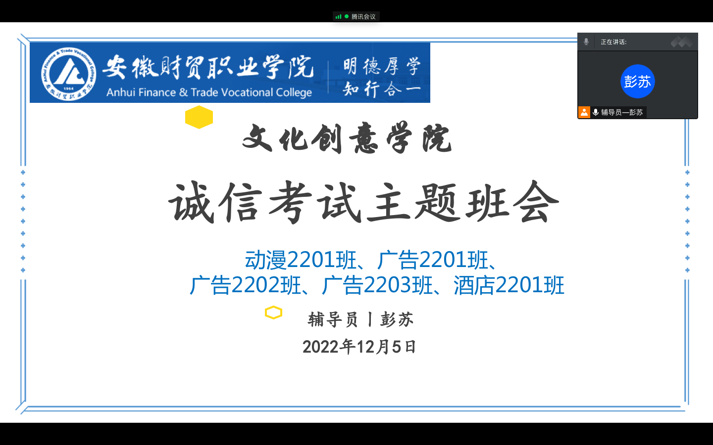根据实际情况,文化创意学院各班召开了线上线下相结合的诚信考试主题班会。会上,辅导员带领学生深入学习学院考试违纪处分办法及反面典型案例,提高学生对考试作弊严重性的认识。介绍线上考试的基本流程和相关规定,强调注意事项,引导学生提前调试好线上考试设备,充分做好考前准备工作,认真面对考试。最后,各班级学生积极签订了诚信考试承诺书,愿意从自身做起自觉抵制考试违规违纪行为,表达自己诚信考试的决心和信心。