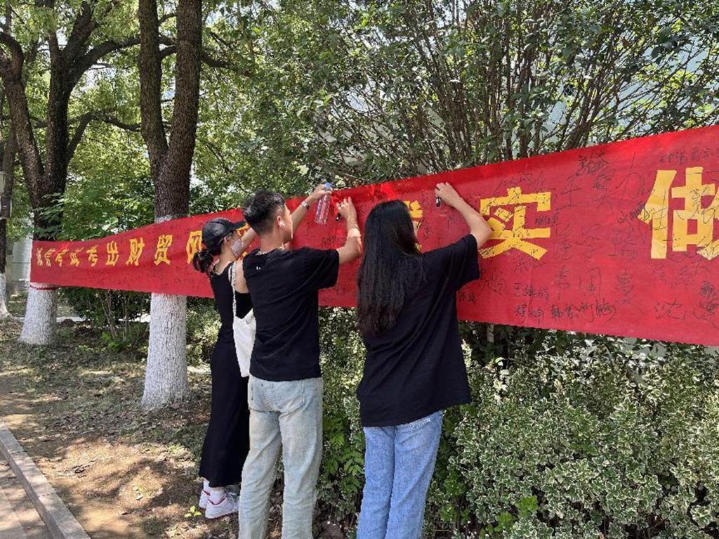 为营造积极向上的考试氛围,树立诚信为本的道德观念,进一步推动考风考纪建设,近日,经济贸易学院在食堂东门开展了一次诚信考试主题签字活动,本次活动面向学校全体学生。活动现场,同学们积极参与,有序地在宣传横幅上签名,承诺诚信考试。