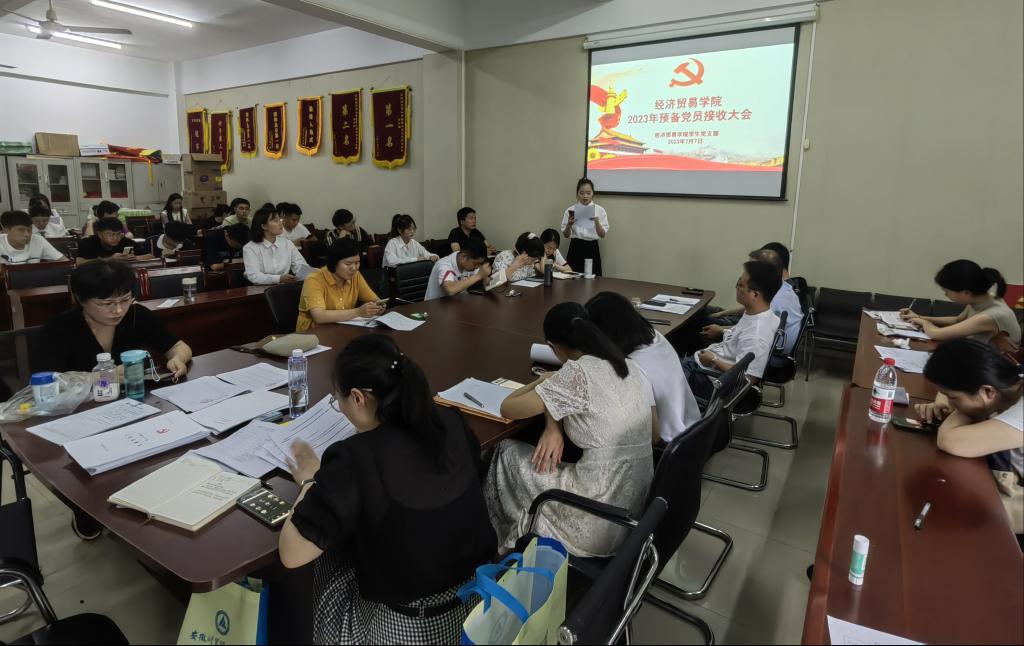 7月7日,经济贸易学院学生党支部召开2023年预备党员接收大会,学生党支部副书记史婉笛同志主持会议,支部全体党员及发展对象培养联系人参加会议。