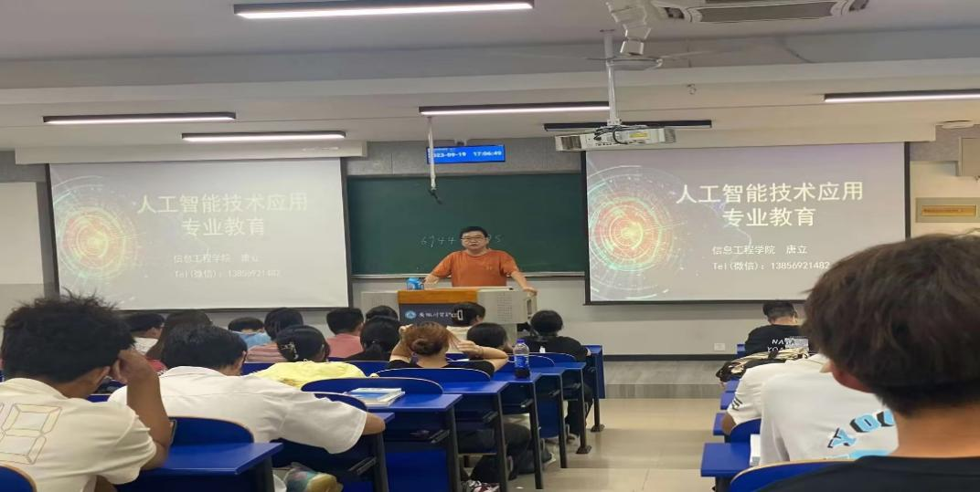 9月19日,人工智能技术应用专业在6201阶梯教室开展2023级新生专业教育讲座,信息工程学院智能2301班、智能2302班全体学生参加。讲座由软件技术教研室副主任唐立主讲。