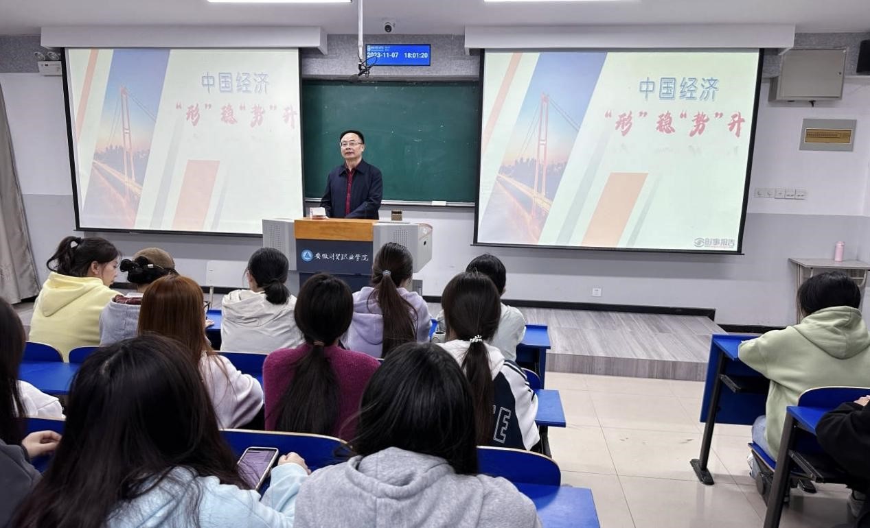 11月7日,经济贸易学院党总支书记陶云龙在教室6101室开展中国经济时政讲座,经济贸易学院近200名学生参加讲座。