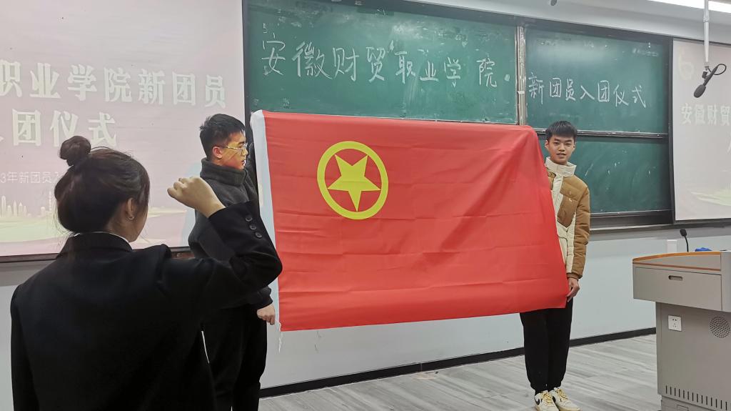 随后,在鲜艳的团旗下,老团员为新团员们佩戴团徽;全体新发展团员面向团旗庄严宣誓,团员青年的铿锵誓言响彻全场。财管2203班王铱椿同学作为新团员代表发言,他用真挚的话语表达内心激动之情,号召全体新团员努力学习,积极工作,以团员的标准严格要求自己,不断努力向前迈进,用青春谱写奋斗乐章。仪式在激昂的团歌声中圆满结束。