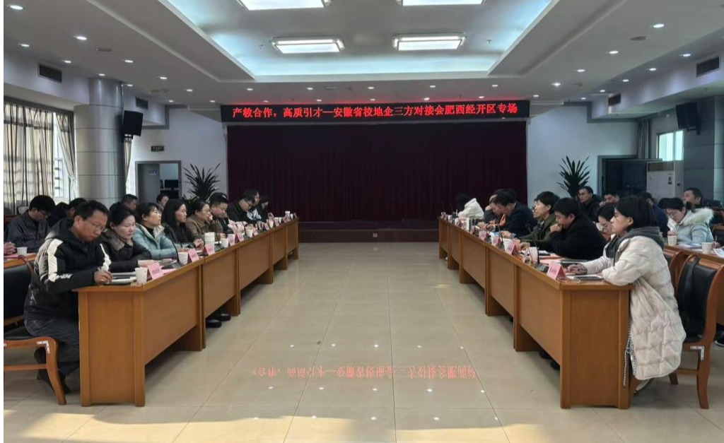 12月12日下午,由安徽省大中专毕业生就业指导中心主办、安徽肥西经济开发区管理委员会承办的“产教合作 高质引才”安徽省校地企三方对接会在肥西经开区召开。学校学生处应邀参加会议。