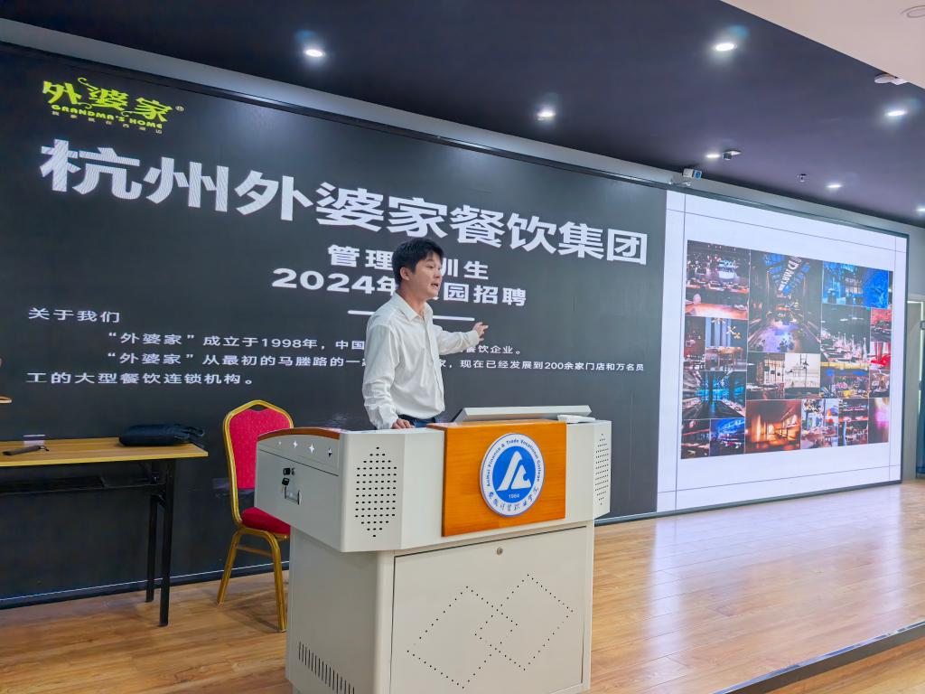 顶度集团有限公司经理朱帅与杭州外婆家餐饮集团有限公司经理刘炼作为企业代表应邀参会。两位经理围绕企业发展历程、业务范围、岗位需求、员工成长机制及福利待遇等维度,进行了全面且细致地介绍,帮助同学们深入了解企业情况与行业发展前景。