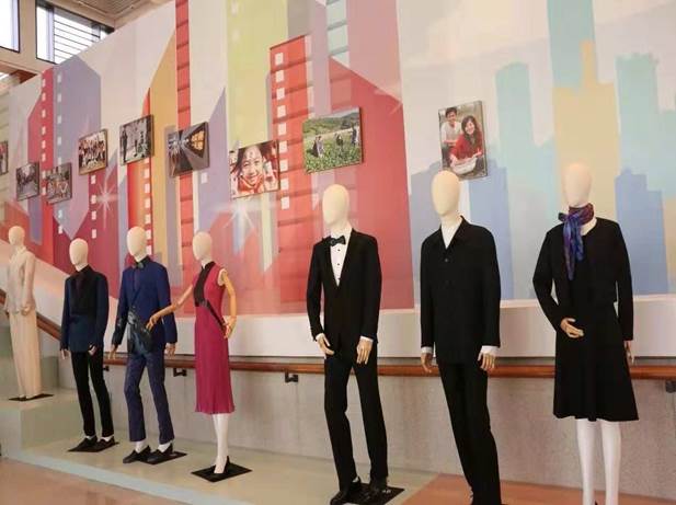 还有“40年服装变化”展,排列在阶梯上的一组人形模特,身穿各个时期的服装,顺着台阶向上走。服装就是时代潮流的风向标,不同年代的服装,特征各异,无不打上了时代的烙印。
