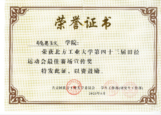 夏日赛场崭锋芒,齐力拼搏向未来。祝贺我院荣获第四十三届田径运动会“最佳赛场宣传奖。展望未来,马院师生定将赛场上展现出的团结拼搏精神,化作百尺竿头更进一步的不竭动力,以饱满热情和实际行动迎接前进征程中的一切挑战,向着更高的目标踔厉奋发,踵事增华。