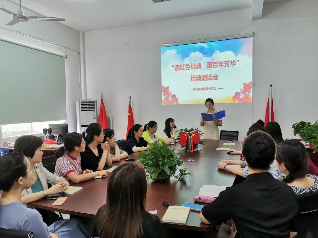 “读红色经典,颂百年芳华”红色经典诵读活动。财会金融学院分工会和文化创意学院分工会举办“学党史,强信念,巾帼建新功”“读红色经典,颂百年芳华”红色经典诵读活动,《赵一曼写给儿子的信》《谁是最可爱的人》《青春之歌》《可爱的中国》《党旗颂》《不朽》《新时代中国共产党的使命》《我们爱你啊,中国》等红色经典篇目,深情回顾了党的百年光辉历程,礼赞党的伟大成就,抒发了对英雄的敬仰、对党的热爱、对祖国的祝福,心灵受到了震撼,思想得到了洗礼,让党史学习教育“声”入人心,致敬光辉百年,牢记初心使命,赓续红色精神,走好新时代的长征路。
