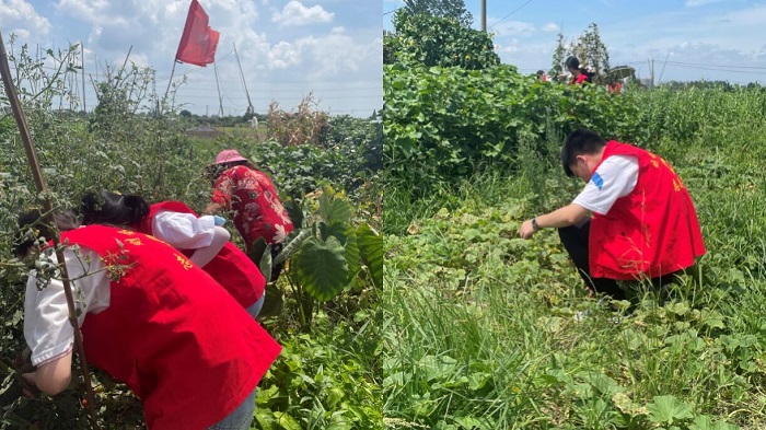 7月21日,实践团队来到当涂县太白墓文化园开展志愿活动,志愿者们在园区内当起导游,给参观游客进行讲解,积极打扫园区卫生,为游客提供干净整洁的环境。当天下午,师生们来到里桥村、竹塘村、港东村、正觉村等地,走村入户开展实地调研,询问村里的产业状况、家庭收入及未来期待。在炎炎烈日下,开展帮助村民采摘新鲜果蔬、搬运农副产品、田间除草等多项助农活动,骄阳烤红了脸颊、汗水湿透了衣背,但同学们劳动劲头一点不减,以自己的实际行动助力乡村振兴,展现青年担当。