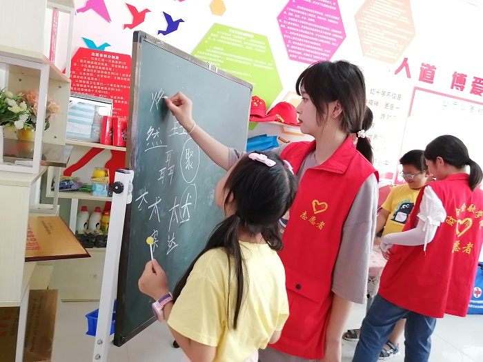 “‘接天莲叶无穷碧,映日荷花别样红’出自哪首古诗?”“壹、贰、叁、肆、伍、陆、柒、捌、玖、拾对应哪些阿拉伯数字?”“马走日,象走田,车走直路炮翻山……”学生志愿者凭借所学知识,发挥自身专业及特长,精心备课,悉心传授,满载一天的志愿服务活动,既让小朋友们增长了知识,又在寓教于乐中培养了他们的学习兴趣。