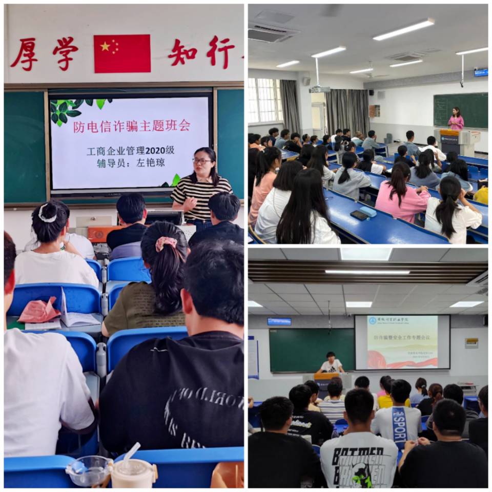 开学至今,经济贸易学院全体辅导员通过线上线下全方位、多角度、立体的向全体在校生、外出顶岗实习学生、大一入学新生,通过“开学第一课”主题班会、通过引导学生关注国家反诈中心APP学习相关知识、每天班级群的QQ警情通报、寝室长的每日督促、主题班会的谆谆教诲、辅导员的个别谈话等,从心理辅导入手杜绝学生防范意识薄弱,贪心、虚荣、占小便宜等容易受骗心理,真正做到24小时无间断,无死角的关注每一位学生,总结整理防诈骗顺口溜“莫贪小、莫转账、打电话”,广而告之。