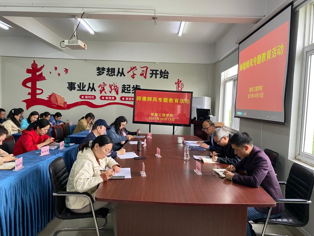 为进一步强化学院师德师风建设,提高全体教职工职业道德素养,落实立德树人根本任务,10月13日下午,信息工程学院组织开展第四次师德师风学习教育活动,学院全体教职工参加学习会,会议由信息工程学院党总支书记邓庆安主持。