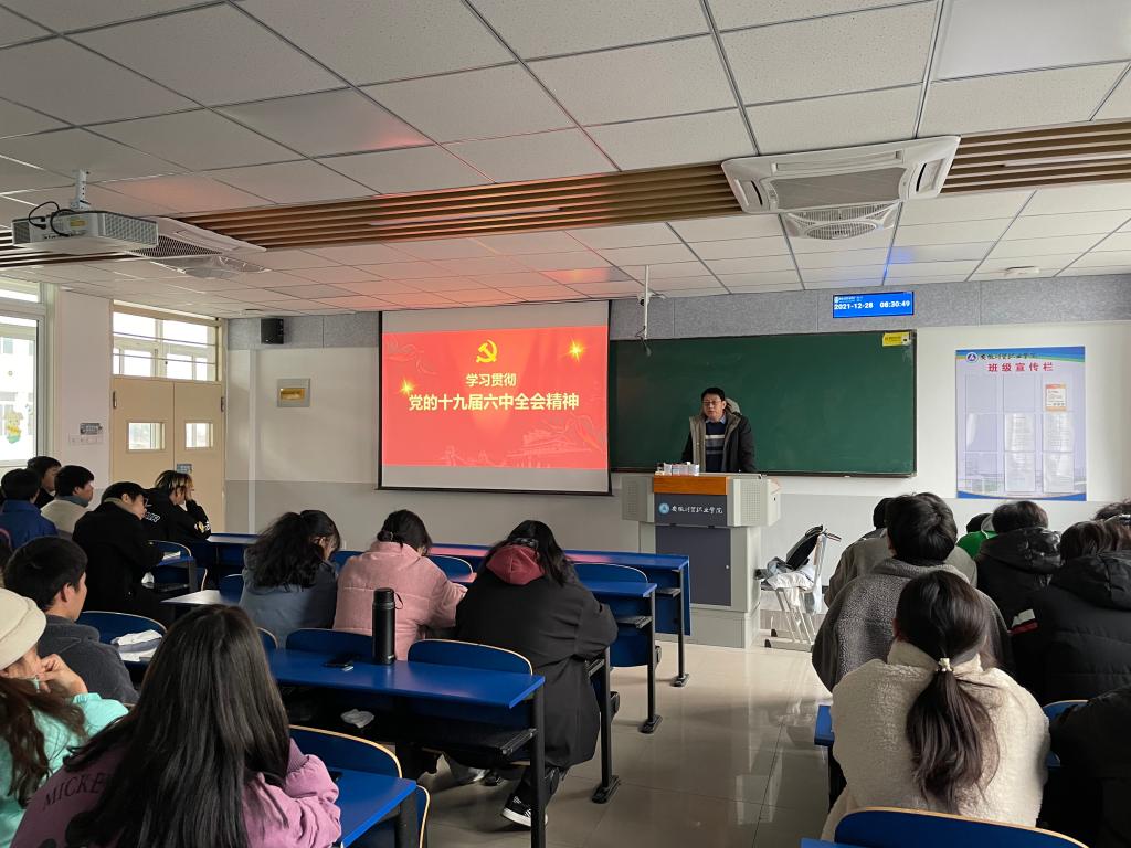 风雨兼程百年路,不忘初心再出发。为做好党的十九届六中全会精神的“三进”工作,12月28日,马克思主义学院党支部书记王良斌为同学们作了一场学习贯彻党的十九届六中全会精神的宣讲。