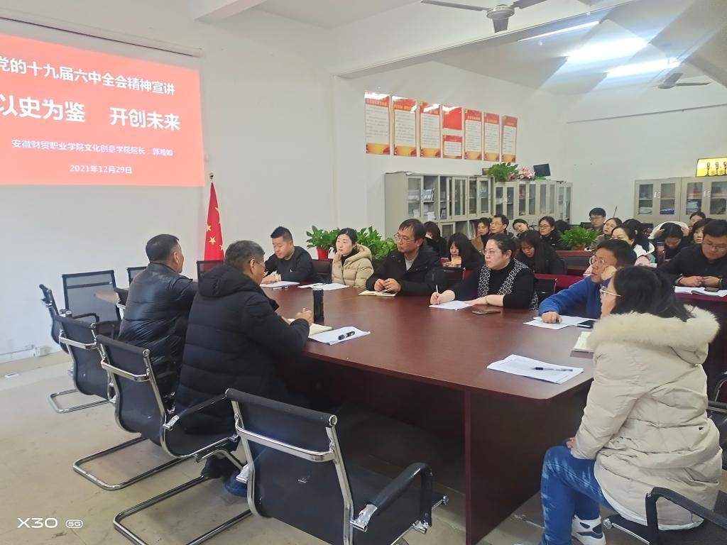 为深入学习贯彻党的十九届六中全会精神,12月29日,文化创意学院党总支书记张克、院长郭湘如分别为文化创意学院全体教师以及党员学生上了一堂“十九届六中全会精神”专题宣讲课。