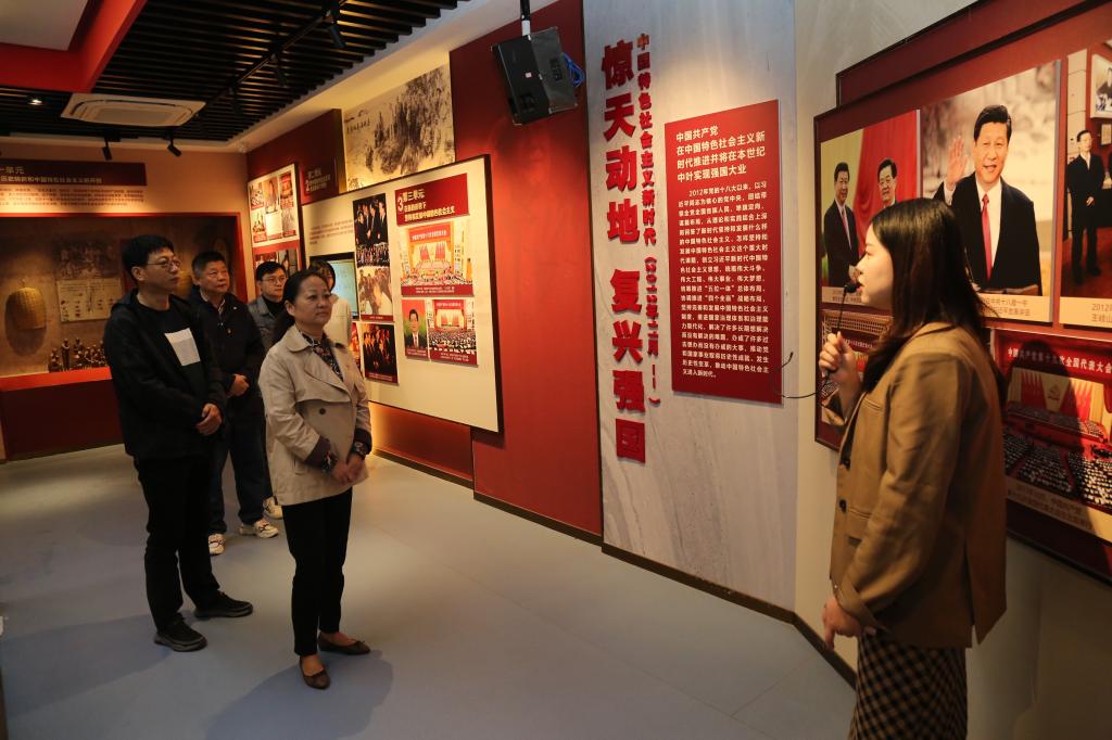 在讲解员石月老师的引导下,先后参观了“爱国馆”和“党史教育馆”,爱国馆以中国梦为核心内容,从国家富强、民族振兴和人民幸福三个方面展开;党史教育馆从新民主主义革命时期、社会主义革命和建设时期、改革开放和社会主义现代化建设新时期、中国特色社会主义新时代进行布展,并通过综合运用环幕影院、红色家书、红色纪念留影等现代科技手段提高参与性,增强互动体验感。
