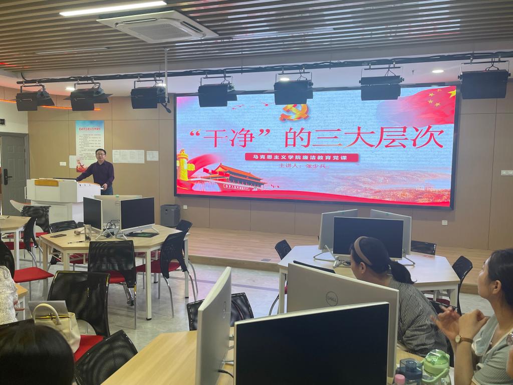 9月28日下午,马克思主义学院在实训楼智慧实训室开展廉洁教育主题党课活动,旨在切实履行好党风廉政建设主体责任,进一步严明政治纪律和政治规矩,全面加强党员教师队伍纪律作风建设。本次党课由马克思主义学院党支部书记张少兵主讲,马院全体党员教师参加。