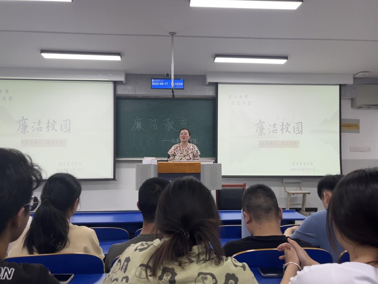 4月17日,经济贸易学院开展廉洁文化宣传教育活动,会议由史婉笛老师主持,全体团学干部参加会议。