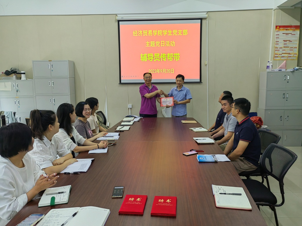 会上,丁蓉介绍了本次主题党日活动的通知要求,并结合工作实际,介绍了近年来学生支部“辅导员传帮带”活动在三个校区开展的整体情况。陶云龙为金志辉等三位受聘辅导员颁发2023-2024学年聘书,并表示,经过近些年的积累,活动取得了良好的效果,鼓励三个校区的传帮带老师在新的学期里传承安财贸优秀辅导员的优良传统,并与新辅导员共同成长。