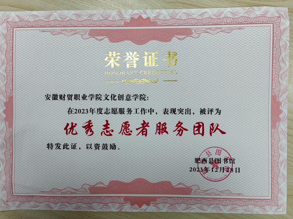 近日,在肥西县图书馆2023年度庆典评选活动中,文化创意学院荣获“优秀志愿者服务团队”。