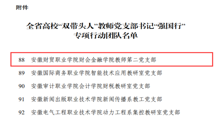 近日,中共安徽省委教育工作委员会公布了全省高校“双带头人”教师党支部书记“强国行”专项行动团队名单,我校财会金融学院教师第二党支部成功入选。