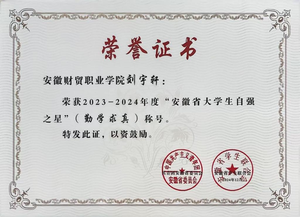 2023—2024年度“安徽省大学生自强之星”寻访活动以“自信自强 挺膺担当”为主题,旨在表彰在学业、科研、创新创业等方面表现突出的优秀大学生,激励广大青年学生自强不息、奋发有为。此次获奖,不仅是对他们个人努力和成就的肯定,也是对学校教育质量和人才培养工作的认可。(供稿:胡其枫  审稿:刘成  廖步岩)