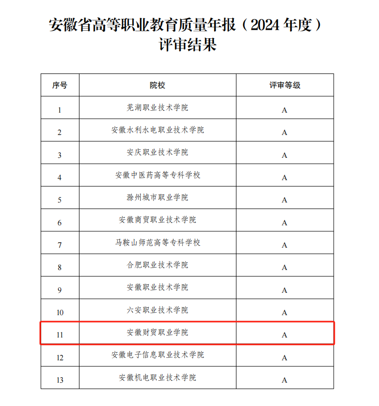 近日,安徽省教育厅公布高等职业院校质量年度报告(2024年度)评定结果,我校质量年度报告(2024年度)荣获A档。我校自2020年省教育厅组织质量年报评审以来,已连续五年获得A档。