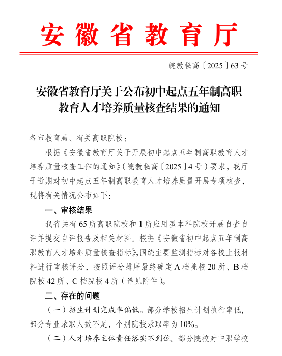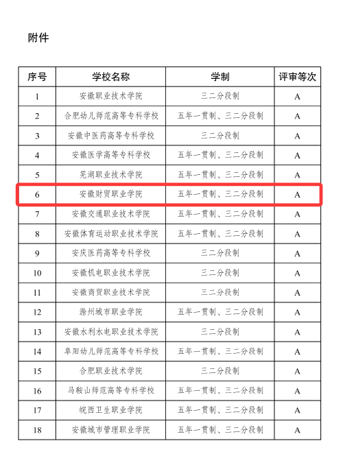 近日,安徽省教育厅公布了初中起点五年制高职教育人才培养质量核查结果,学校荣获A档。