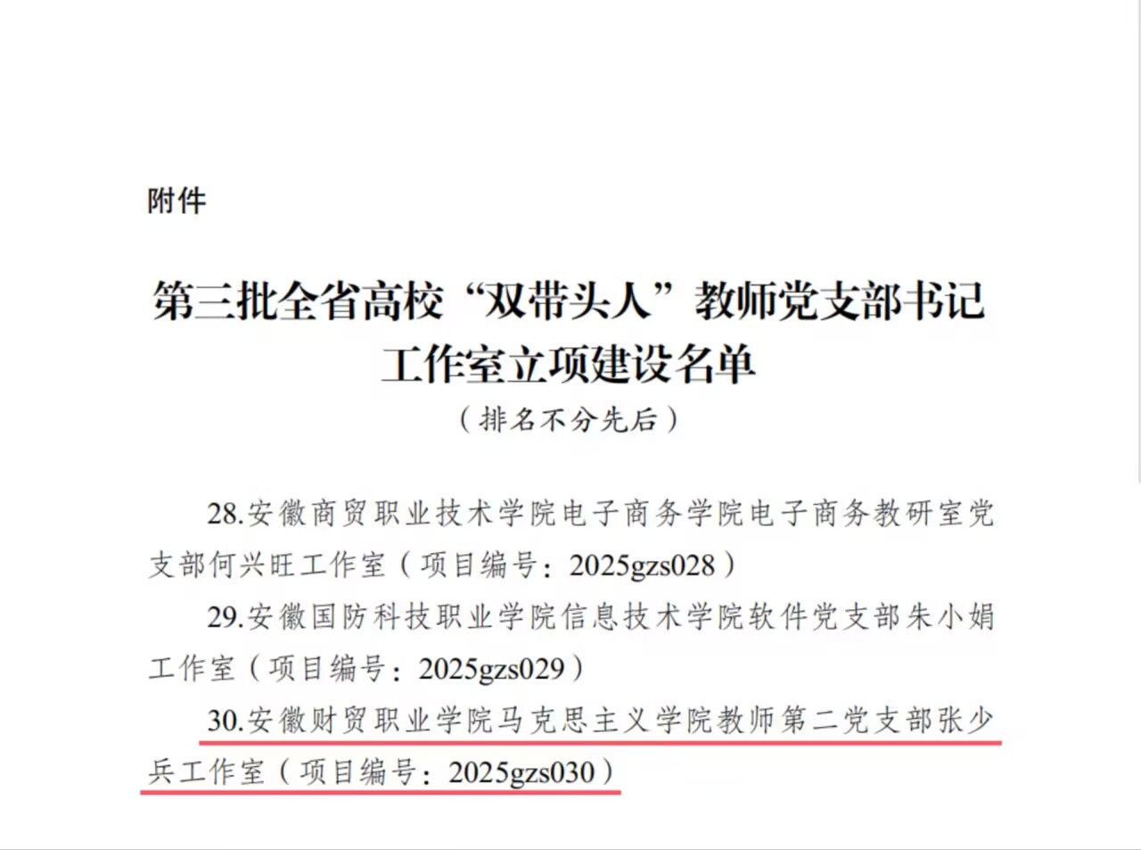 近日,安徽省委教育工委公布了第三批全省高校“双带头人”教师党支部书记工作室立项建设名单,共遴选建设30个“双带头人”工作室,我校马克思主义学院教师第二党支部张少兵工作室成功入选。