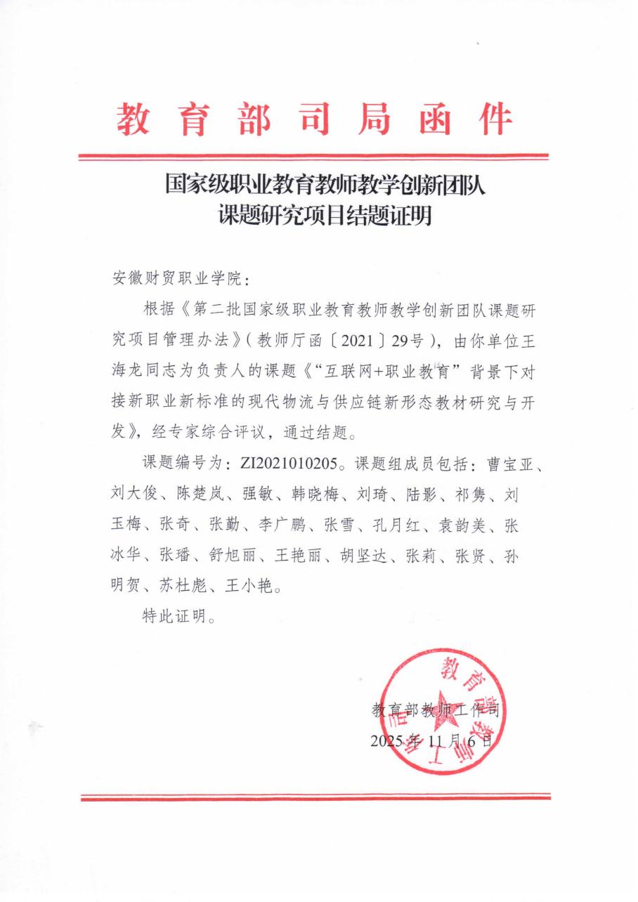 近日,教育部教师工作司发函,学校党委委员、副校长王海龙主持的《“互联网+职业教育”背景下对接新职业新标准的现代物流与供应链新形态教材研究与开发》课题,圆满通过结题验收。