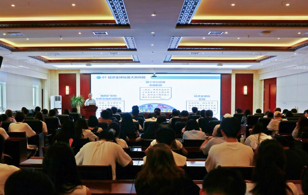 学校党委副书记、副校长何翔以“把握经济全球化大势,扩大高水平对外开放”为主题进行了深入的讲解,阐述了经济全球化的新阶段、新特点和新趋势,揭示了经济全球化的历史意义和现实价值,以及其演变趋势,引导广大学子深刻领悟中国坚持经济全球化正确方向,扩大高水平对外开放,既是对经济规律的深刻把握,也是对历史潮流的自觉顺应。