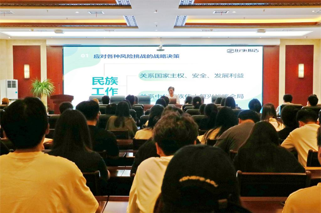学校党委委员、副校长胡戴新以“铸牢中华民族共同体意识”为主题,阐明了铸牢中华民族共同体意识的时代背景、重大意义、深刻内涵和实践路径,教育引导青年学生牢固树立正确的中华民族历史观,牢固树立休戚与共、荣辱与共、生死与共、命运与共的共同体理念,增强对伟大祖国、中华民族、中华文化、中国共产党、中国特色社会主义的认同,增强铸牢中华民族共同体意识的政治自觉和责任担当,以实际行动为强国建设、民族复兴贡献青春力量。