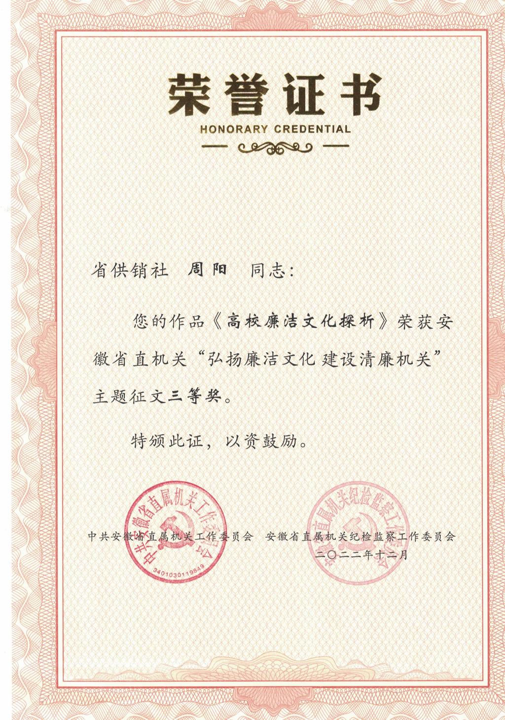 近日,由中共安徽省直属机关工作委员会和安徽省直属机关纪检监察工作委员会举办的省直机关“弘扬廉洁文化 建设清廉机关”主题征文活动获奖名单公布,我校财会金融学院教师周阳的《高校廉洁文化探析》一文荣获三等奖。