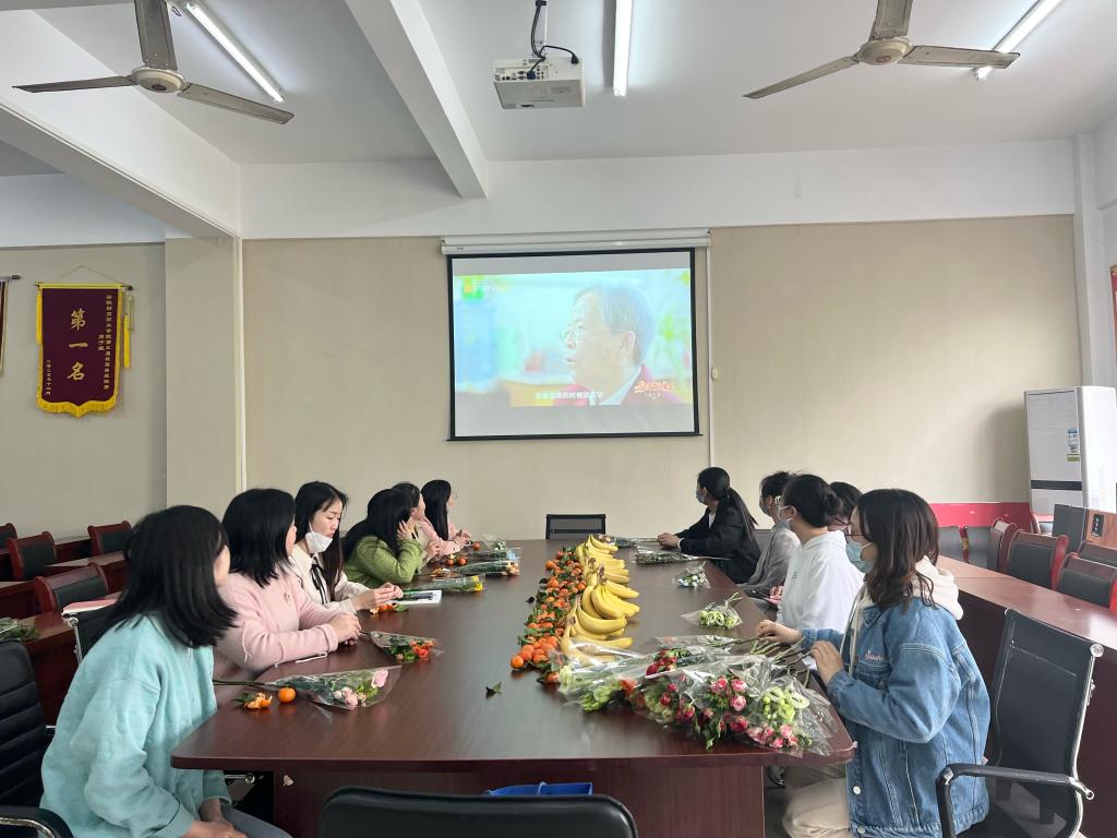 观影前,经济贸易学院分工会为前来观影的女教师准备了鲜花和水果。经济贸易学院党总支副书记丁蓉为现场女教师们送上了节日的祝福。
