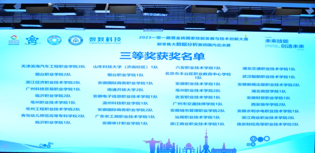 11月25日,2023“一带一路”暨金砖国家技能发展与技术创新大赛新零售大数据分析赛项国内赛决赛在安徽合肥成功举行,此次大赛全国范围内共有124支队伍参与角逐。由凌勇和孙青松老师指导的商务数据分析与应用专业解雨欣、钱炳森团队,陈小芳、吴小调老师指导的商务数据分析与应用专业李思雨、魏雨欣团队,分别获得了国内赛总决赛二等奖和三等奖。
