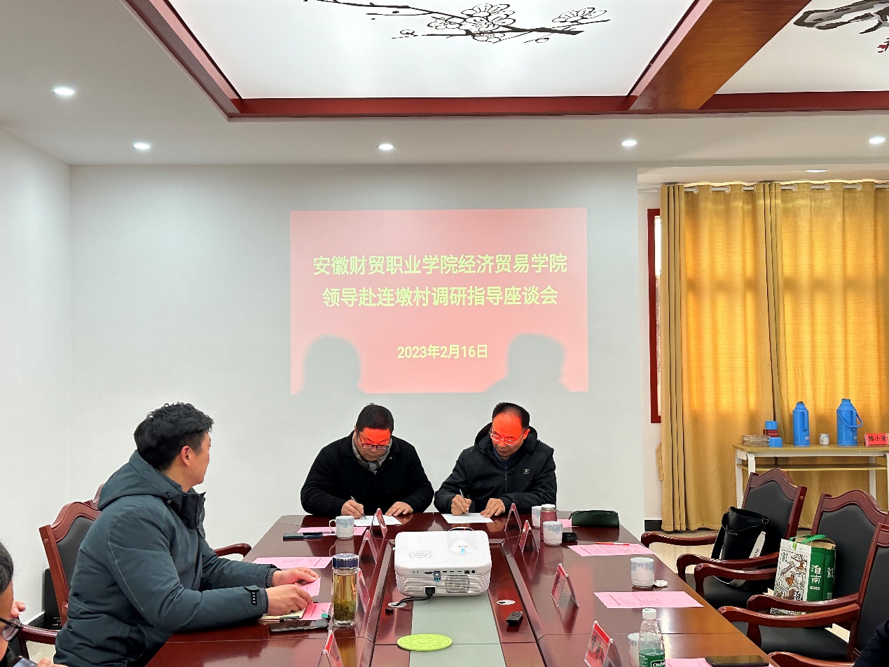 2月16日,经济贸易学院党总支在六安市金安区孙岗镇电商集聚中心会议室举行经济贸易学院党总支与孙岗镇村委支部的“党建共建基地”签约仪式。经济贸易学院党总支书记陶云龙、院长黄诗义及各支部书记和教研室主任、安徽财贸职业学院驻六安市金安区孙岗镇连墩村乡村振兴工作队队长第一书记 王学峰、连墩村村委副书记刘万宗及村委班子成员参加了本次活动。