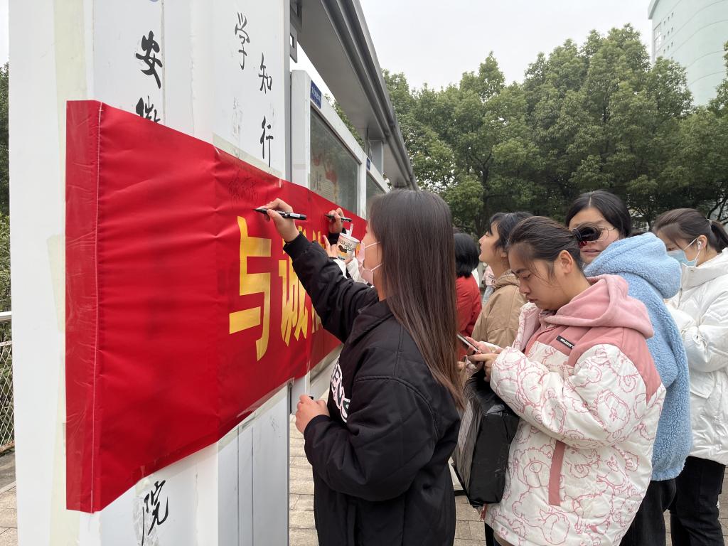 活动开始,同学们陆续到达现场有序排队,在“与诚信携手同行,与舞弊挥手告别”字样的横幅上进行签字。严寒天气丝毫没有阻挡同学们参加活动的热情,签字仪式上,同学们纷纷在签名墙上写下自己的姓名,承诺诚信考试。现场很多同学发布朋友圈表明自己诚信考试的决心,呼吁更多同学共同践行诚信考试承诺。活动负责人还提出诚信应考倡议,希望每位同学遵守考试纪律,诚信考试,认真复习,积极备考。