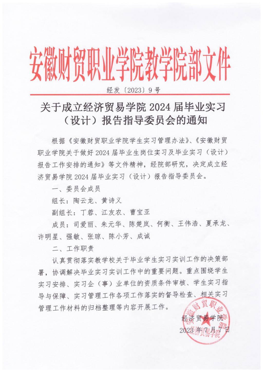 关于成立经济贸易学院2024届毕业实习(设计)报告指导委员会的通知