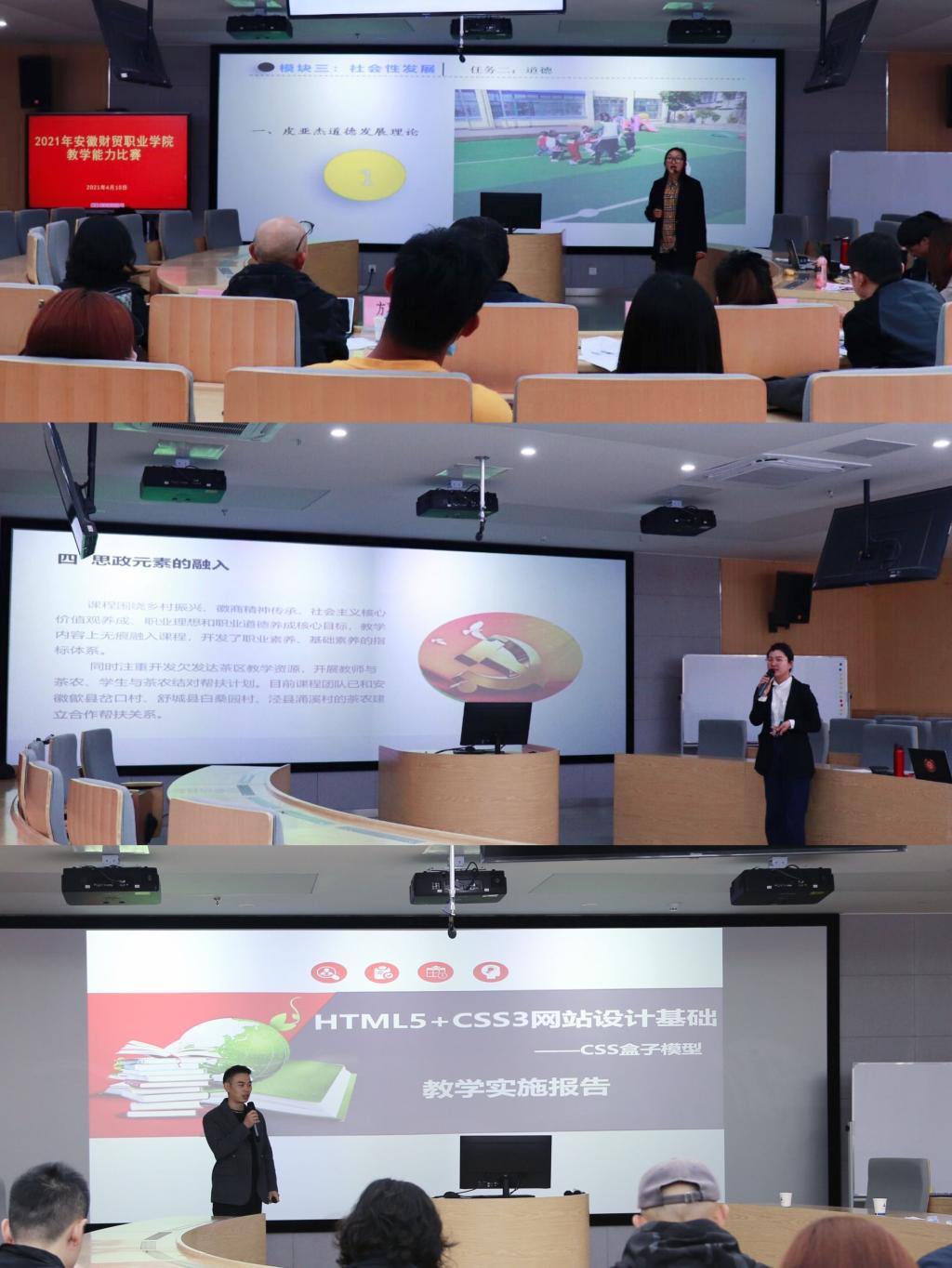 4月10—11日,安徽财贸职业学院教师教学能力比赛在新实训楼五楼的A502举办。经各二级院部推荐,本次比赛共54个参赛队121位教师参赛,其中“综合教学能力”赛项27个参赛队94位教师,“课程思政”赛项27个参赛队27位教师。本次比赛采取现场网络初评和现场决赛结合的形式,比赛现场紧张激烈、亮点纷呈,参赛老师着装典雅规范、精神饱满充沛、教态自然大方,参赛内容详实。
