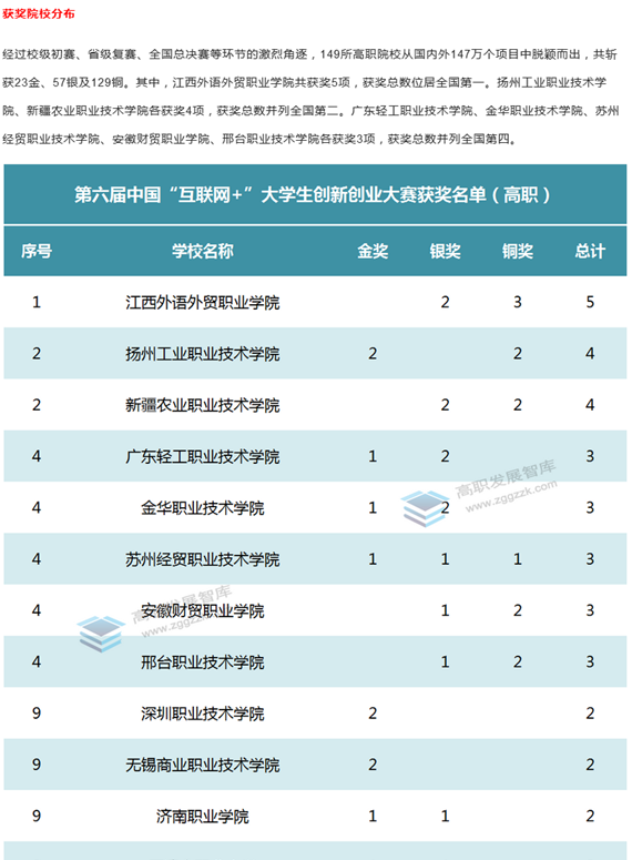 第六届中国国际“互联网+”大学生创新创业大赛获奖名单(高职)公示链接:http://www.zggzzk.com/redianzixun/shownews.php?id=807