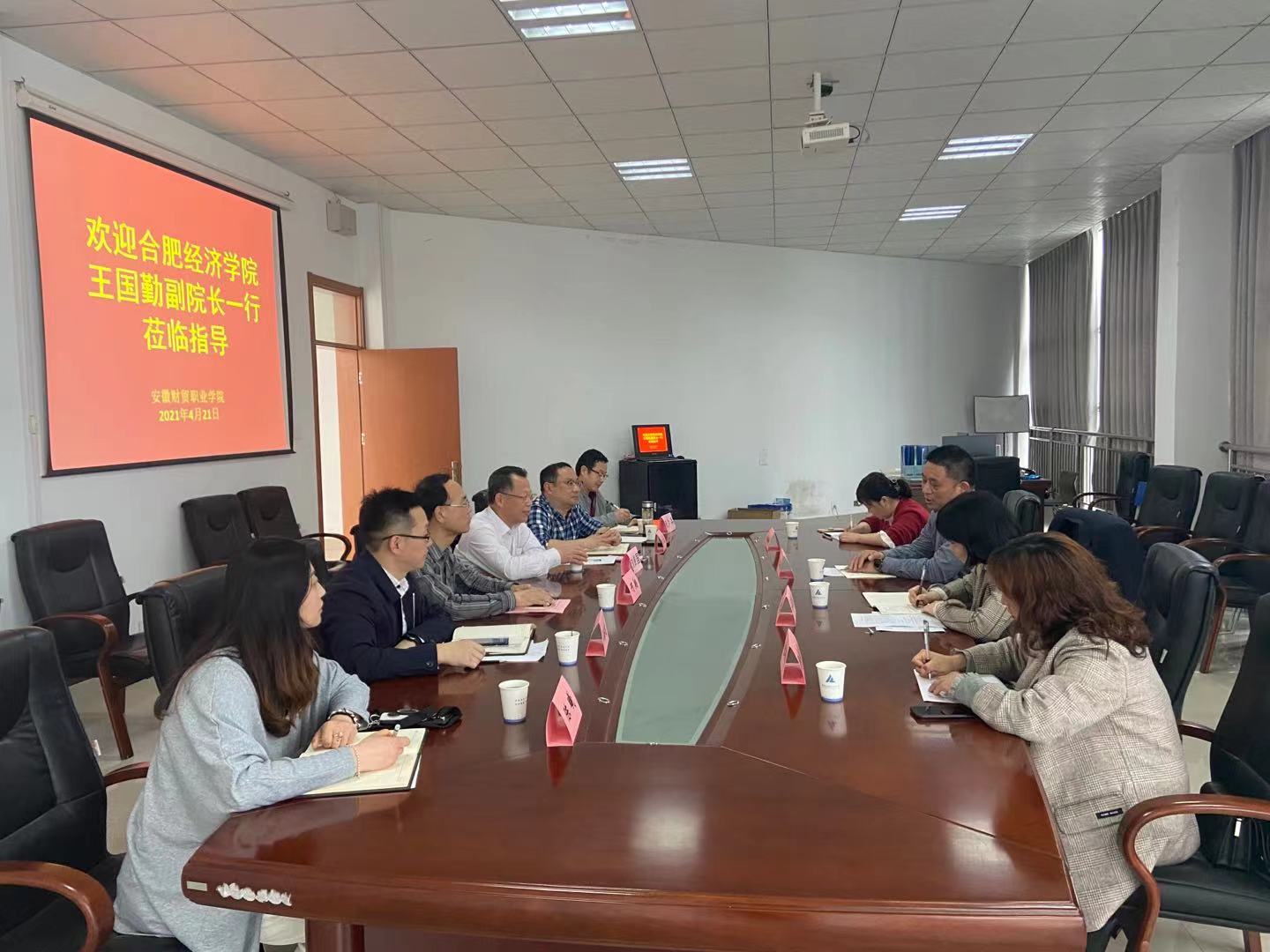 近日,合肥经济学院党委委员、副院长王国勤一行来校就双创教育及“互联网+”大赛的组织等工作进行考察交流。党委副书记、院长刘银国、党委副书记、纪委书记何翔等接待来访。