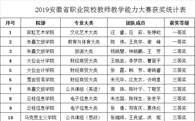 2019年安徽省高等职业院校教学能力大赛的赛项赛制全新升级,本次大赛共计收到373件作品,覆盖19个专业大类,参赛教师首次突破千人,创历史新高。我校派出33位老师组成11个团队参加省赛,经过初赛和现场决赛的披荆斩棘,宾虹艺术学院汪睿、应莉、张婷屹团队,朱熹文旅学院陈伟、王良存、谢峰团队,分别以所在专业组的第一名斩获一等奖;朱熹文旅学院钱晓慧、钟晓鹏、王芳团队获得二等奖;王晓岩等7个团队获得三等奖。本次比赛充分展现了我校教师出色的个人素质、良好的团队精神和扎实的教学功底,是我校教师队伍不断成长、教学改革不断攻坚、教育质量不断提高的良好展示。