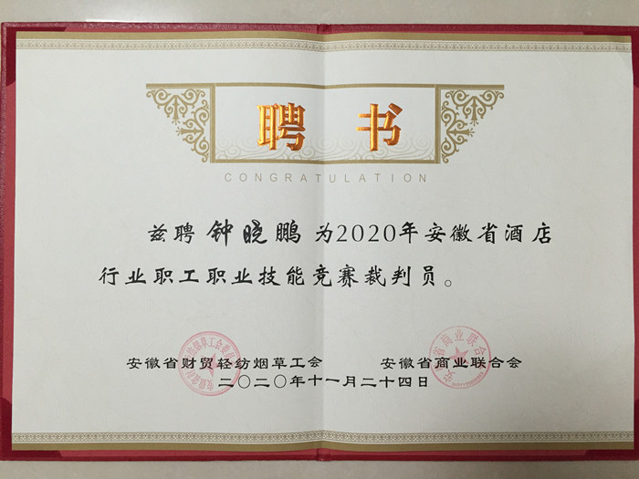 近日,在2020年度安徽省酒店行业职工职业技能竞赛中,教务处副处长钟晓鹏应邀担任本次竞赛客房服务(中式铺床)赛项的裁判工作。