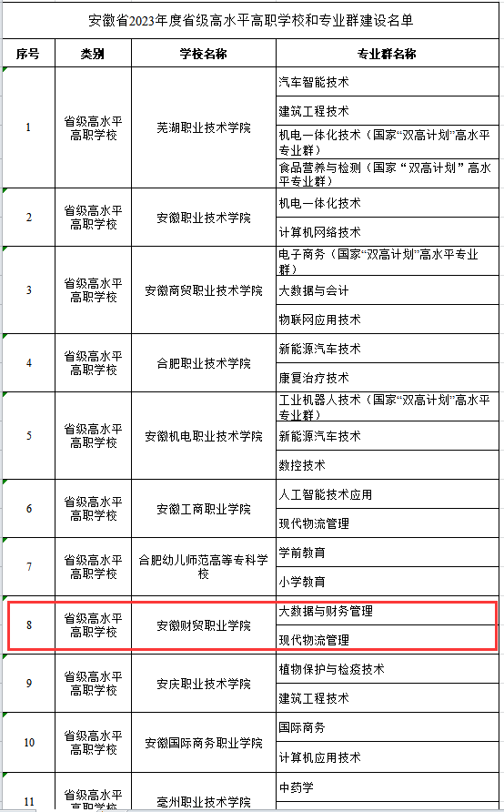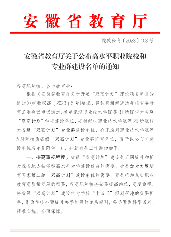 近日,安徽省教育厅印发《安徽省教育厅关于公布高水平职业院校和专业群建设名单的通知》,公布了“安徽省高水平职业院校和专业群建设计划”建设单位名单,我校成功入选省级“双高计划”学校建设单位。大数据与财务管理、现代物流管理两个专业群列为重点建设专业群。