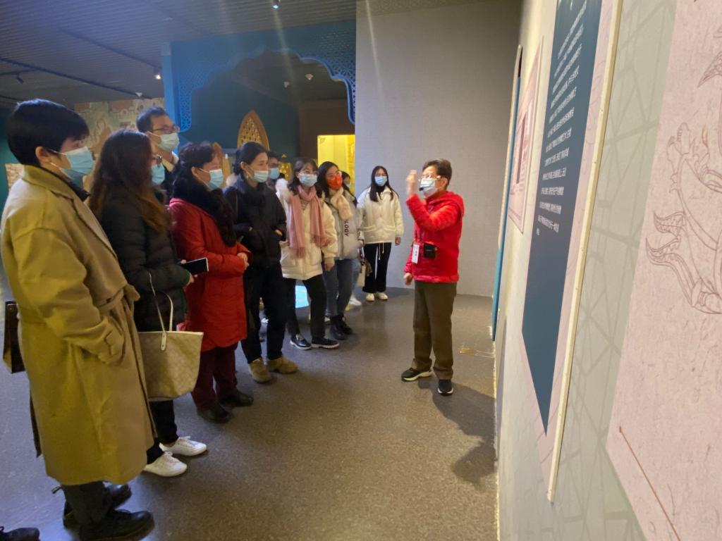 在志愿者讲解员的带领下,全体党员教师依次参观了“丝路雏形”、“丝路华章”、“丝路梵音”三个部分展区,全面了解了新疆作为中国古丝绸之路枢纽和东西方文化交流汇聚之地的历史发展变革。这些来自新疆的历史文物向世界证实,新疆各民族是中华民族大家庭的重要成员,新疆各民族文化是中华文明的重要组成部分。同时历史也在印证着只有依靠祖国的强大富足,新疆才能实现经济发展和社会民众安康,只有确保新疆的安定团结,新疆才有可能依托国家“一带一路”倡议发展契机,成为东西方经济贸易往来、文化交流融合的桥梁和枢纽,再现如汉唐盛世时期那般欣欣向荣、丰富多彩的繁盛景象。